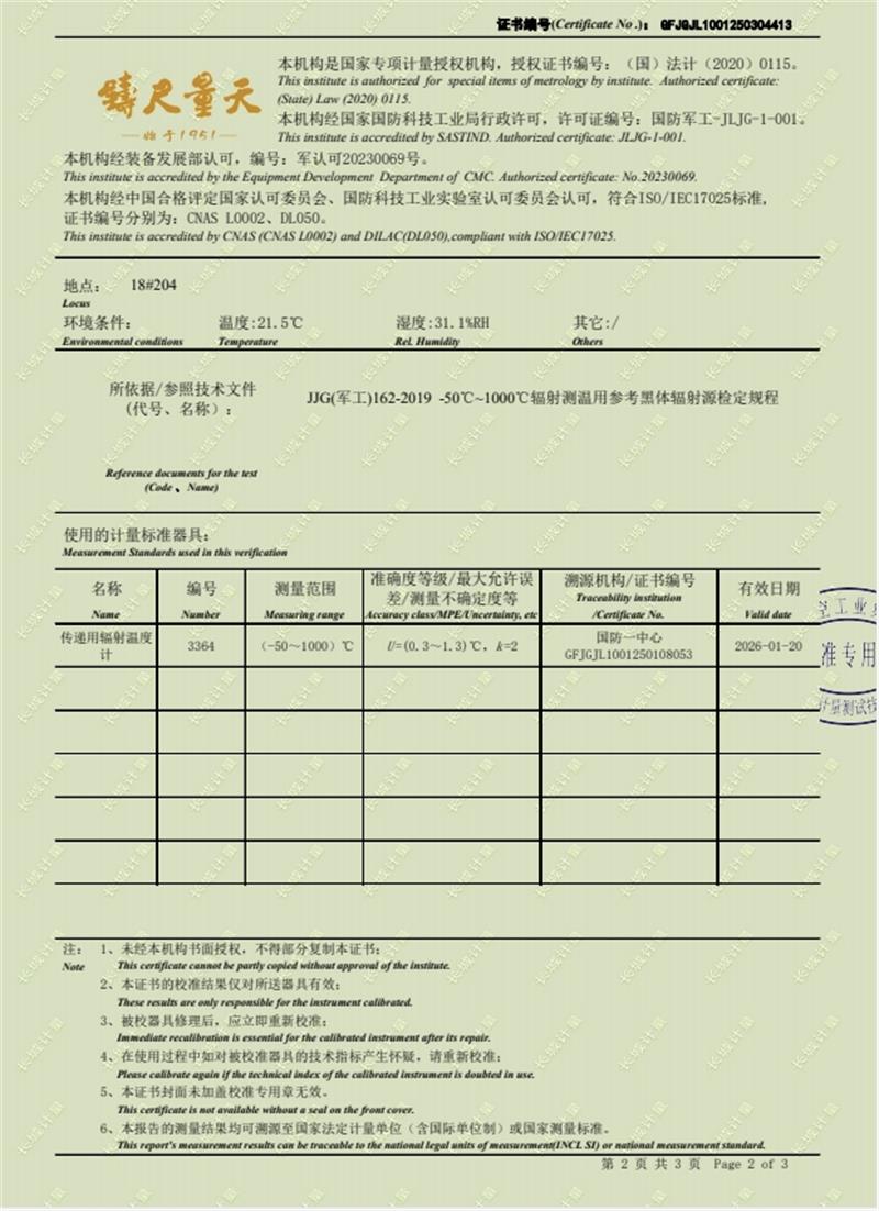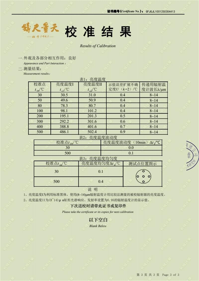 面源黑體爐(室溫+5-500℃)校準證書 2025-3-15 本文被閱讀 6317 次