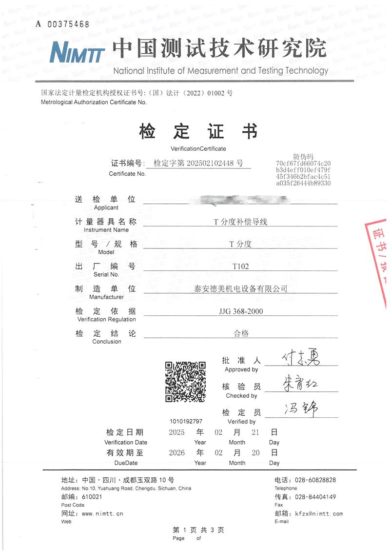 T分度補(bǔ)償導(dǎo)線檢定證書 2025-2-25 本文被閱讀 5602 次