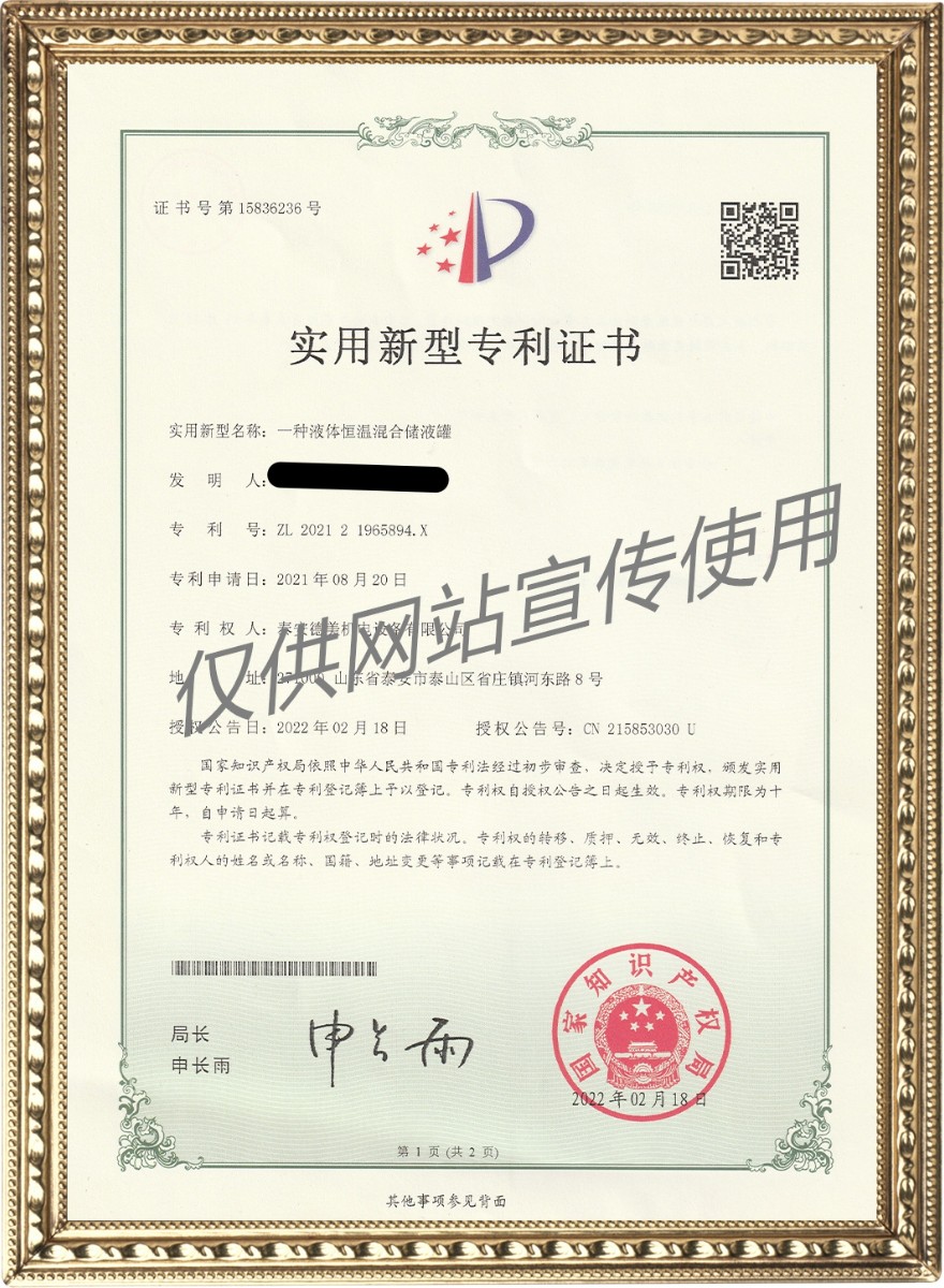 一種液體恒溫混合儲液罐——實用新型專利證書