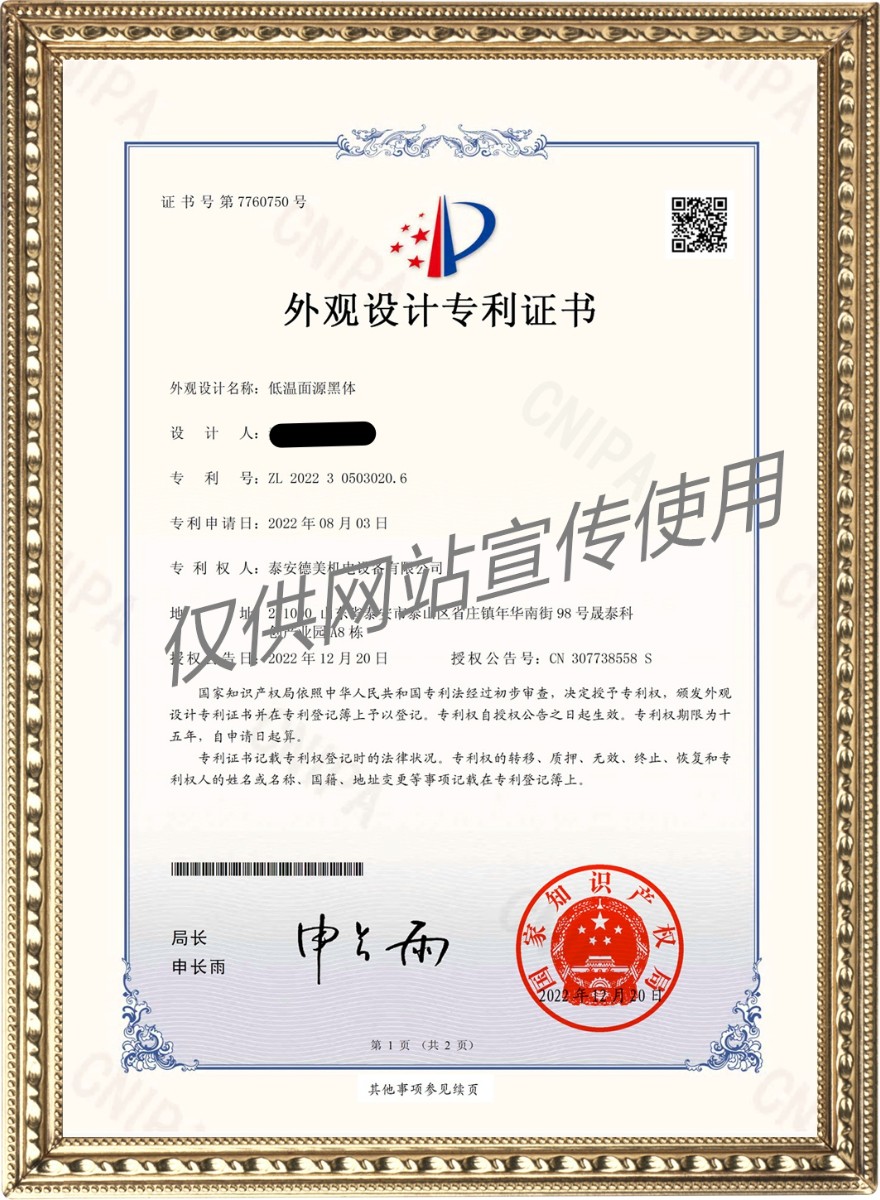 低溫面源黑體——外觀設(shè)計(jì)專利證書