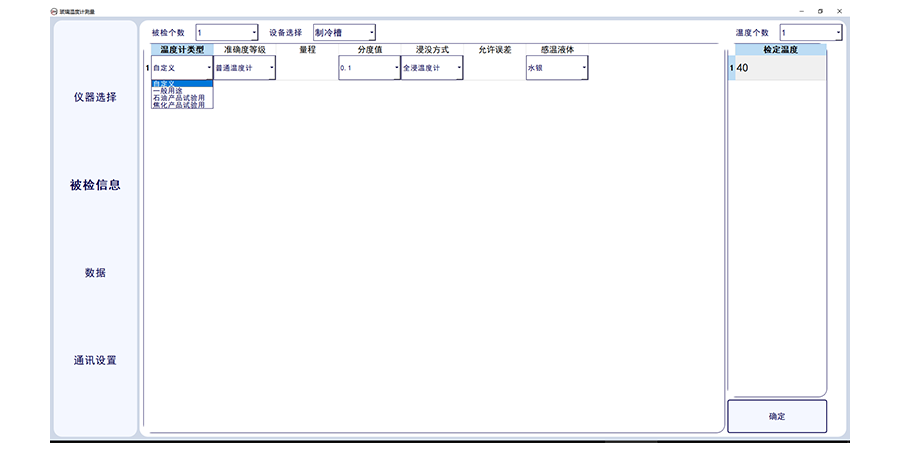 4.可進(jìn)行玻璃溫度計的類型選擇,選擇分度值、浸沒類型計允差,判斷溫度是否合格,