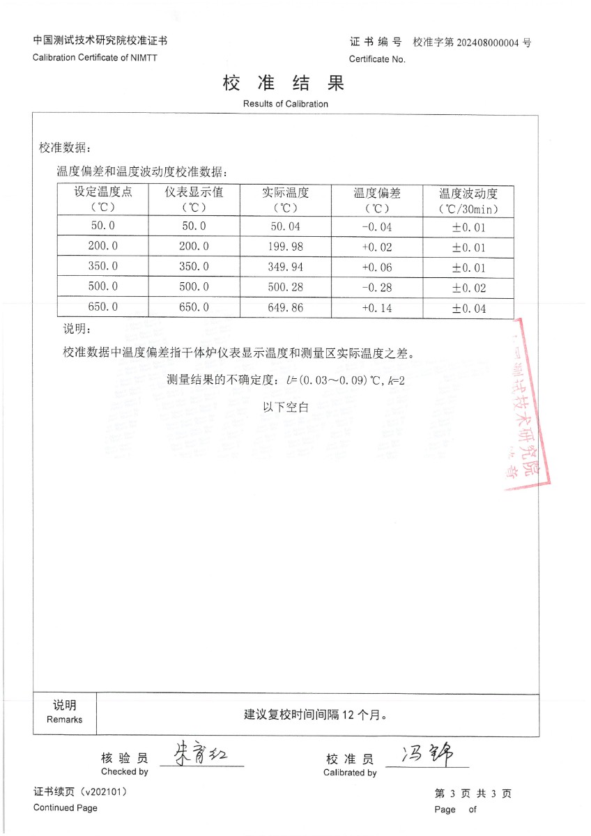 干體爐301(室溫+5℃~650℃)校準證書 2024-8-5 本文被閱讀 8099 次