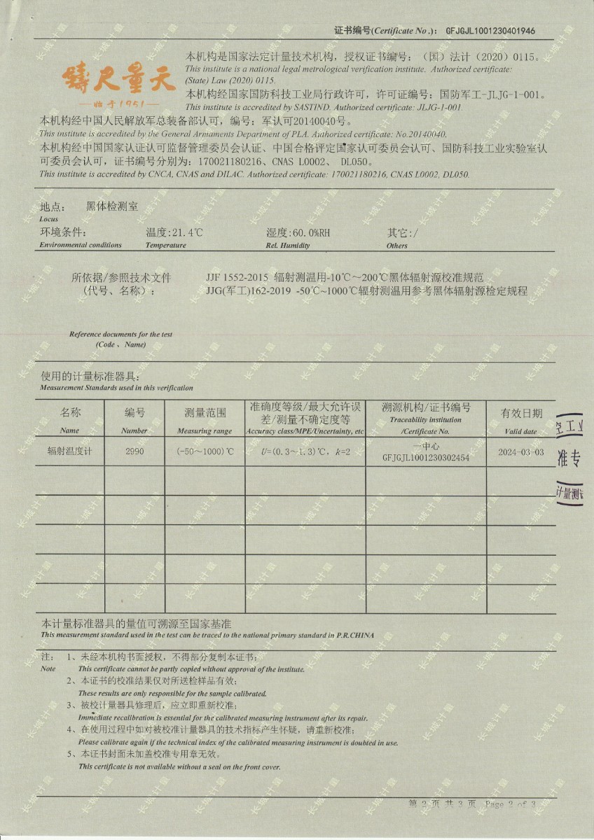 浙江弘志計量測試有限公司 黑體輻射源 校準證書 2023-5-4 本文被閱讀 14384 次