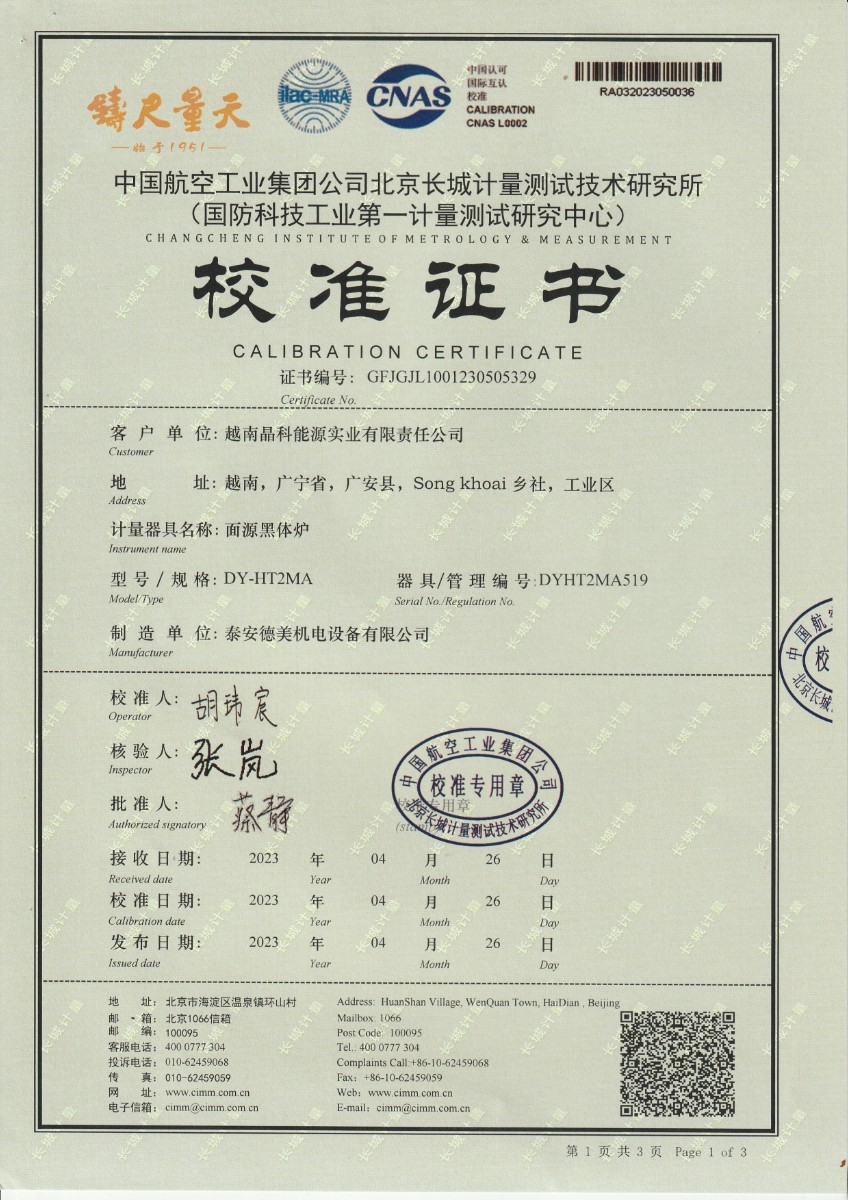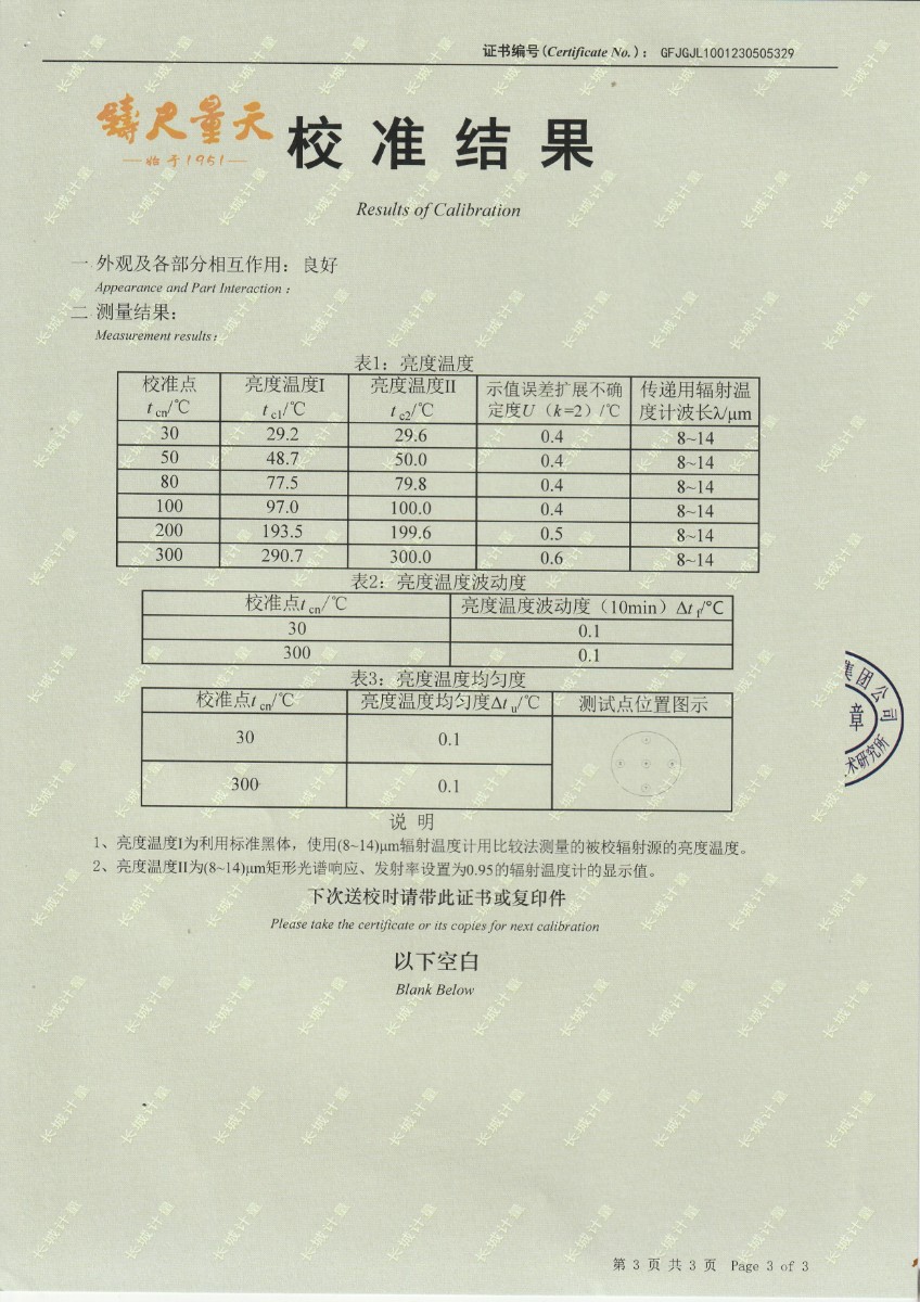 | 上一條:淮安捷泰新能源科技有限公司 黑體輻射源 校準(zhǔn)證書 | 下一條:廉金屬熱電偶檢定爐-校準(zhǔn)證書 |