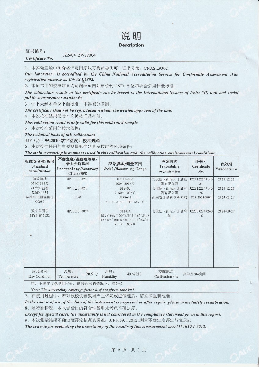 高精度數(shù)字溫度計(jì)校準(zhǔn)證書
