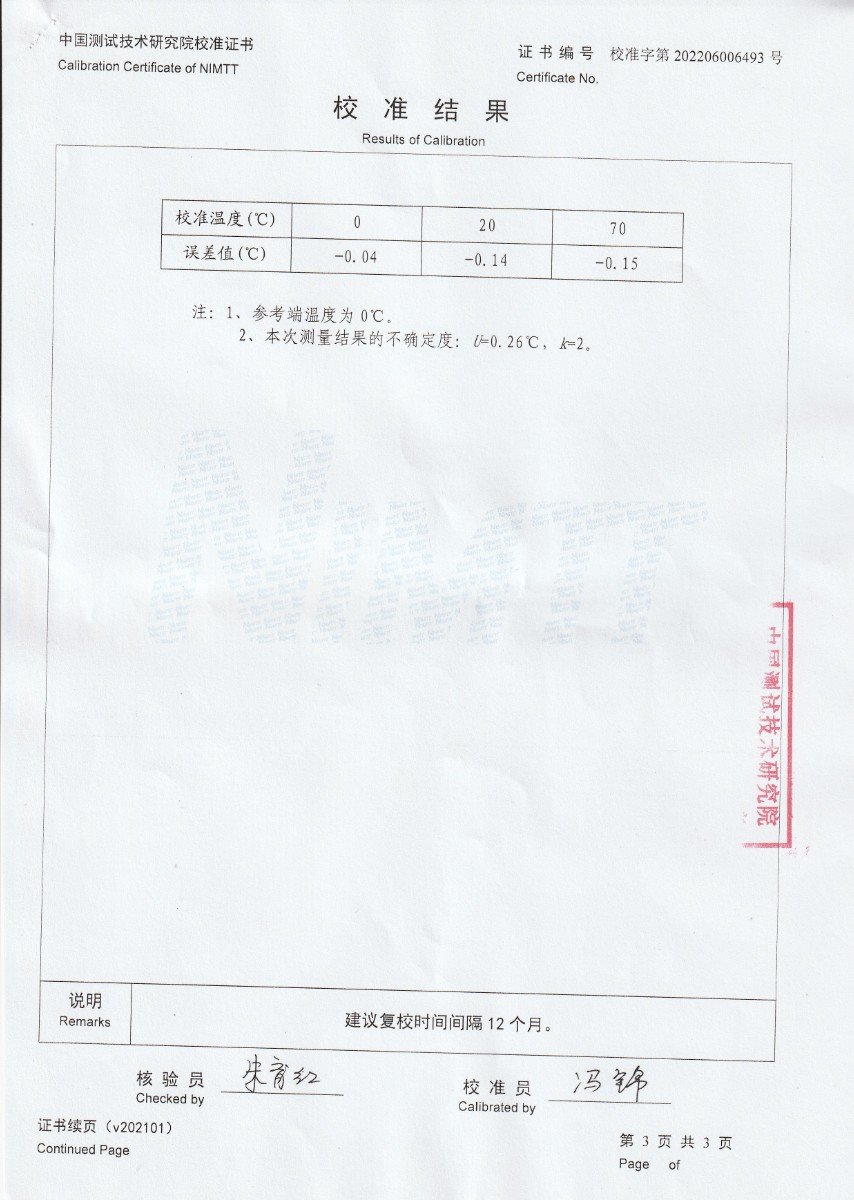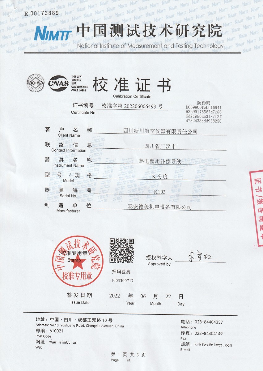 | 上一條:四川新川航空儀器有限責(zé)任公司-S分度補償導(dǎo)線 | 下一條:廉金屬熱電偶檢定爐-校準(zhǔn)證書 |