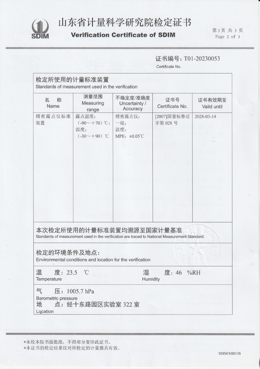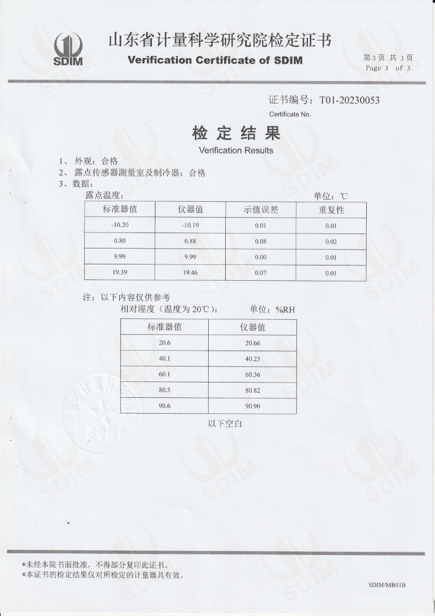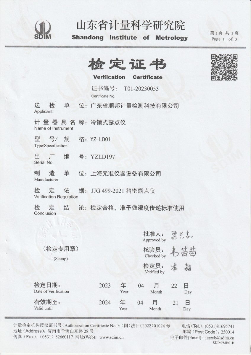 廣東省順邦計量檢測科技有限公司 冷鏡式露點儀 檢定證書 2023-5-4 本文被閱讀 10073 次