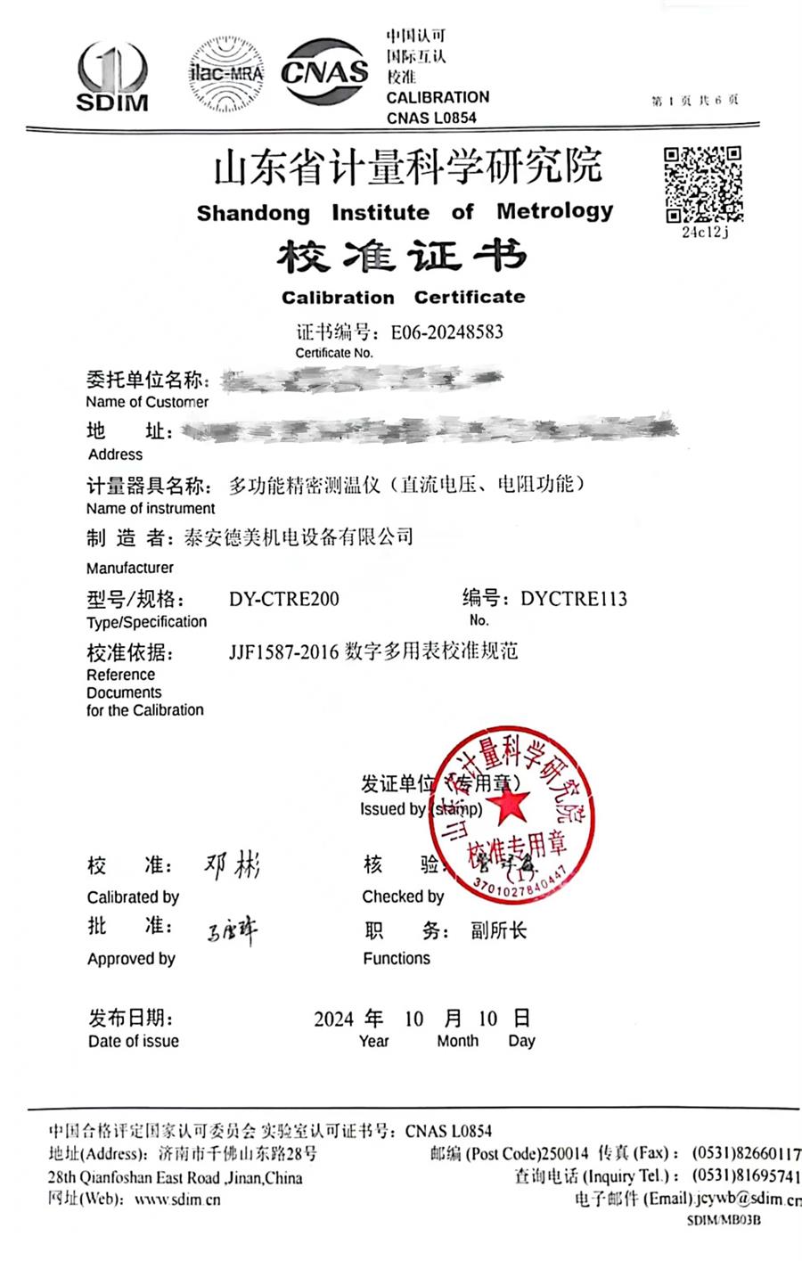 多功能測溫儀校準證書 2024-10-11 本文被閱讀 9150 次