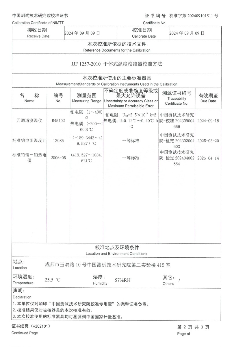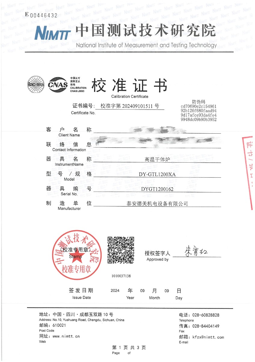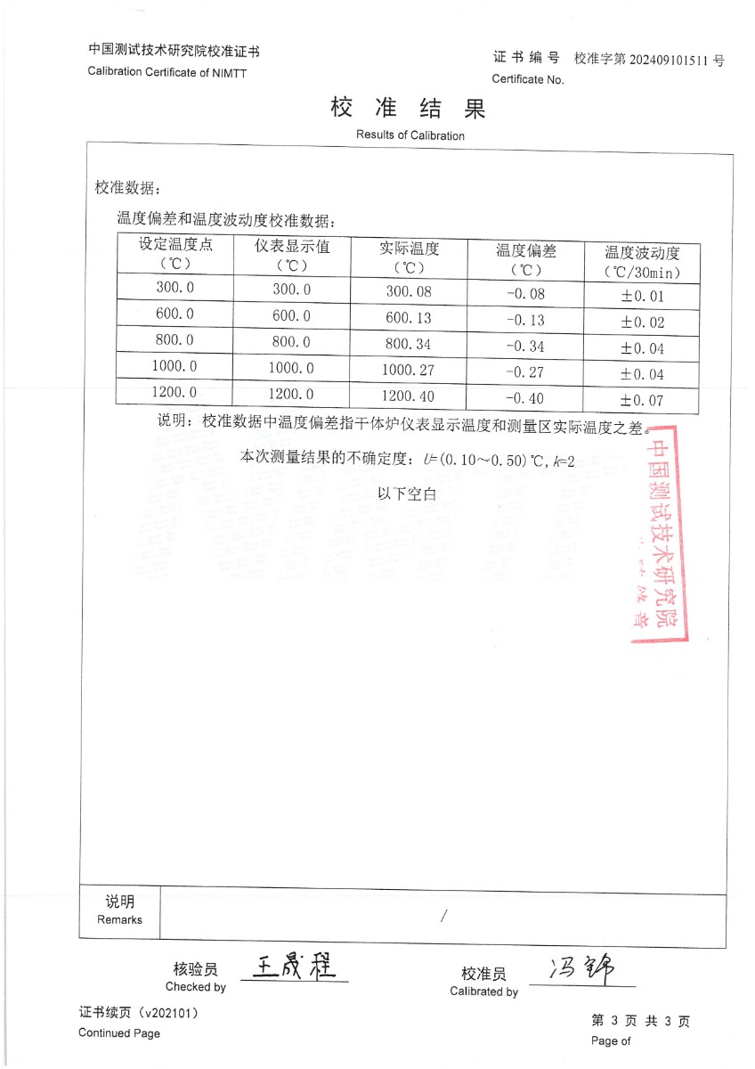 高溫干體爐(300~1200℃)校準證書 2024-9-11 本文被閱讀 7177 次