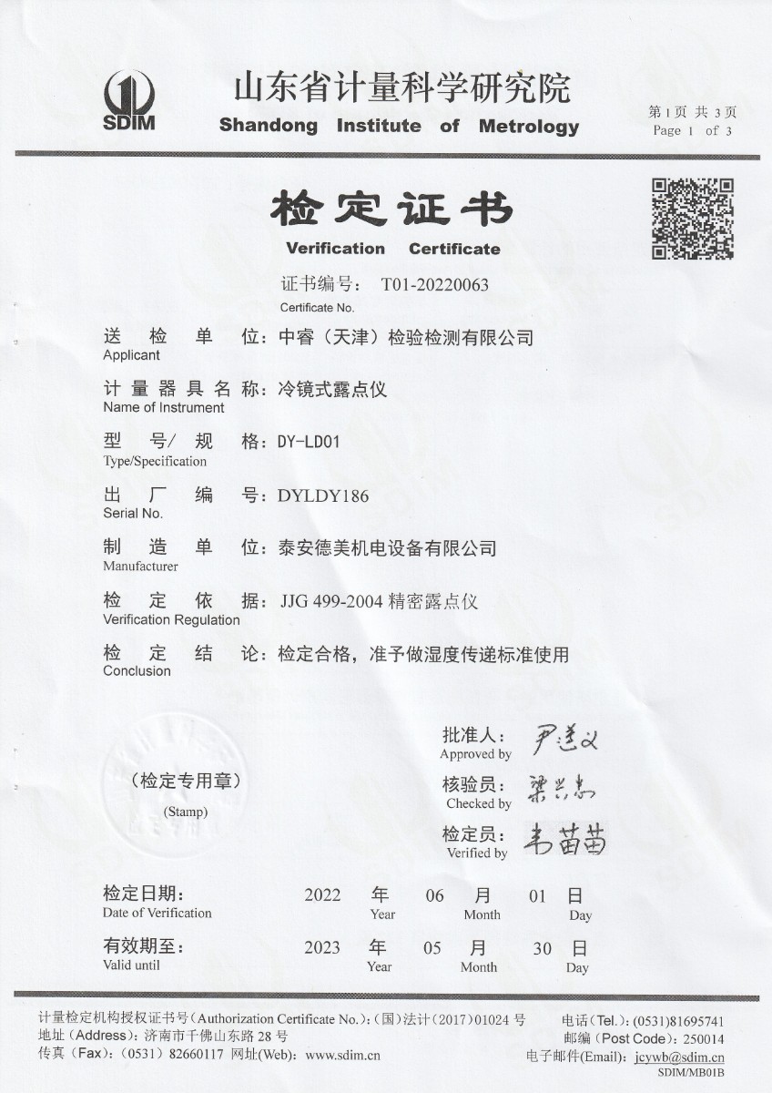 | 上一條:中睿(天津)檢驗(yàn)檢測(cè)有限公司-冷鏡式露點(diǎn)儀校準(zhǔn)證書 | 下一條:廉金屬熱電偶檢定爐-校準(zhǔn)證書 |