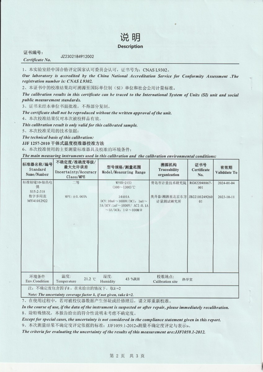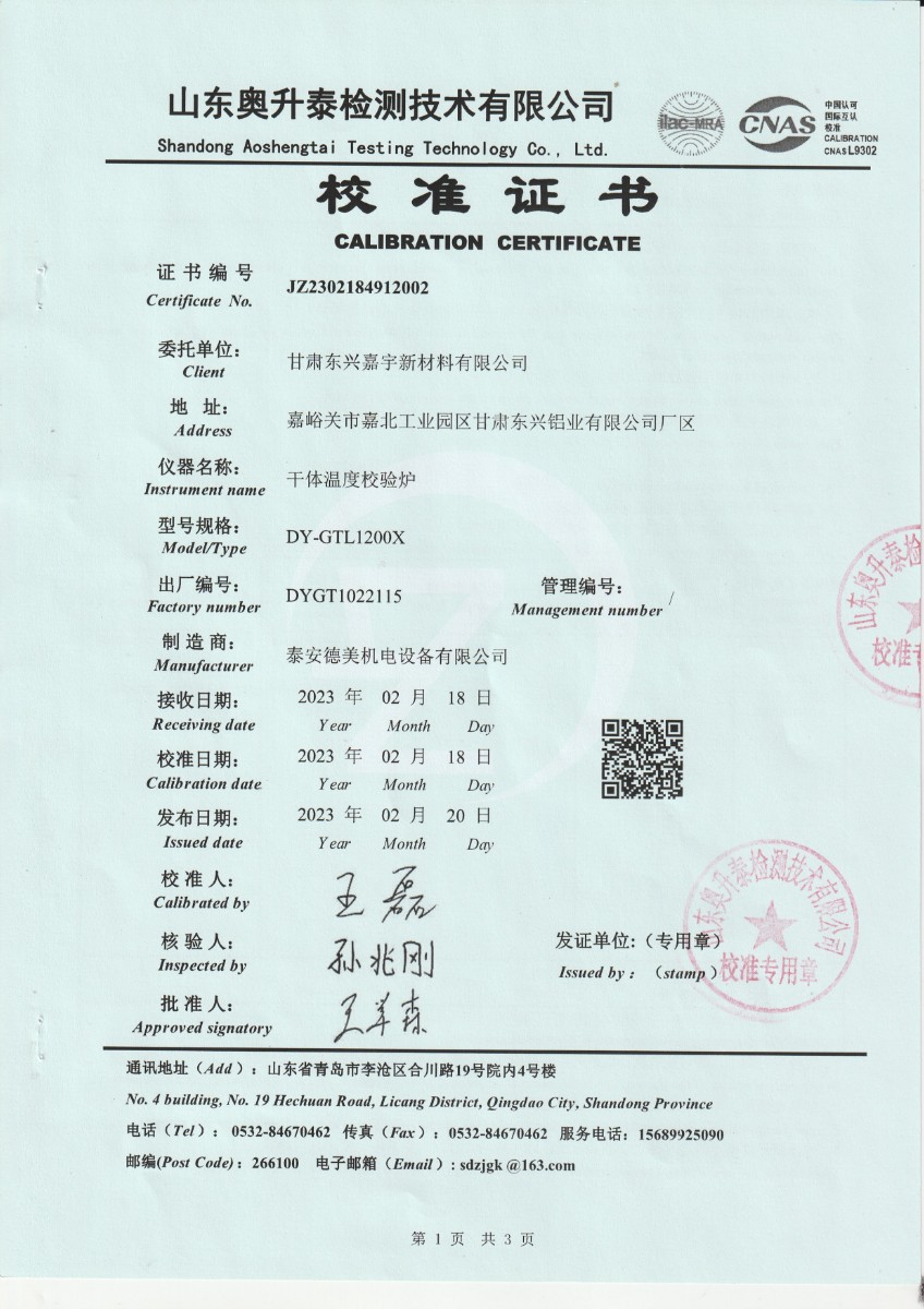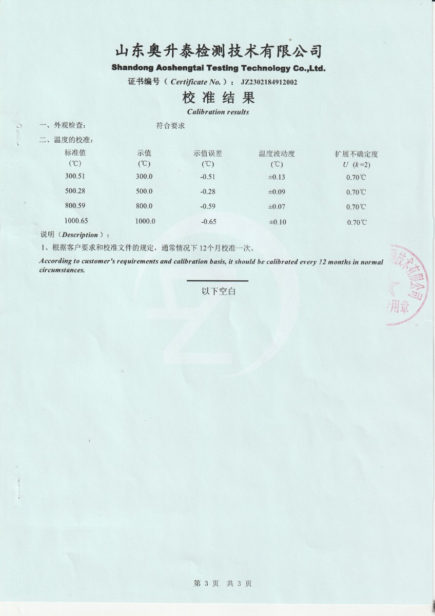 | 上一條:甘肅東興嘉宇新材料有限公司 干體溫度校驗(yàn)爐 校準(zhǔn)證書(1) | 下一條:廉金屬熱電偶檢定爐-校準(zhǔn)證書 |